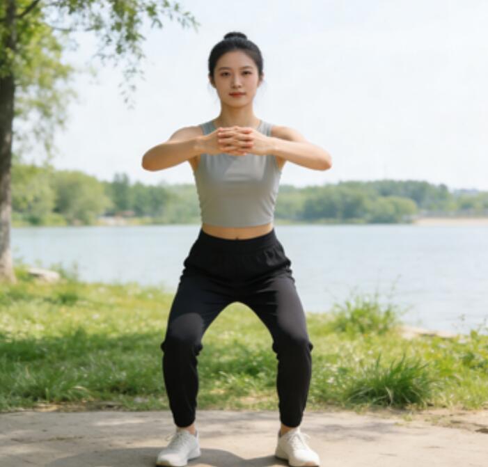方法:站立,双脚分开与肩同宽,脖颈伸直。双手抬至胸前,上下重叠或前伸,挺胸立腰,颌下收,保持身体背部挺直,慢慢弯曲膝盖和髋关节,像要坐上椅子一样。不要让膝盖弯在脚趾前面,在就要接触到椅子时停下,颈、背尽量伸直保持1秒,然后站起来。连续做3次。注意力集中在腰腹。要求颈、背尽量伸直,双脚要站稳。